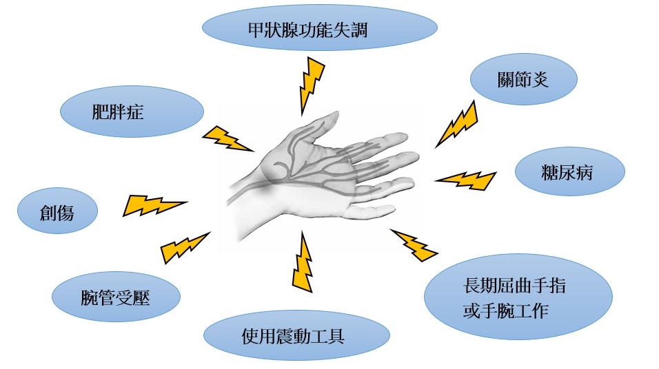 腕管综合症(Carpal Tunnel Syndrome)泛指一般由于正中神经在腕管通道内受压而起的病症,由于正中神经负责拇指和前三指的感觉和肌肉控制,腕管综合症主要症状包括拇指、食指、中指及桡侧无名指感觉麻痺和刺痛,拇指根部亦可能有较弱的握力,甚至肌肉萎缩。